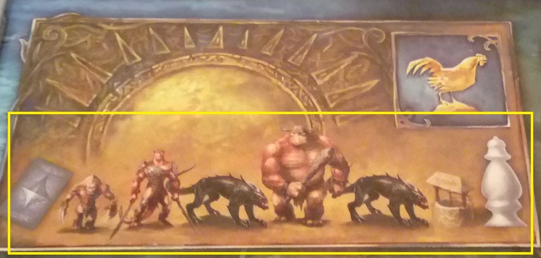 No obstante, en cada casilla solo puede haber un monstruo, sea del tipo que sea. Si un monstruo va a moverse a una casilla que está ya ocupada por otro la saltará, moviéndose entonces hacia la siguiente casilla siguiendo la dirección de la flecha que haya en la casilla ocupada. En otras palabras, un monstruo cuando se mueve debe desplazarse a la primera casilla que haya libre de monstruos siguiendo la dirección de las flechas impresas en el tablero. Esto puede conllevar a que los monstruos se sincronicen perfectamente y hagan unas cadenas de la hostia, cadenas que debéis romper para no perder la partida. Si os fijáis en el tablero de juego veréis que todas las flechas, sino la mayoría, crean una ruta que va directamente al castillo, y es que la gracia de Las leyendas de Andor es defenderlo para no ser derrotados.
